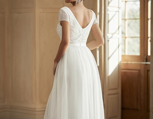 Elegant V-Neck Lace Embroidered Wedding Dress with Floral Appliqué, Fitted A-Line Silhouette, Multi-Layer Tulle Skirt.